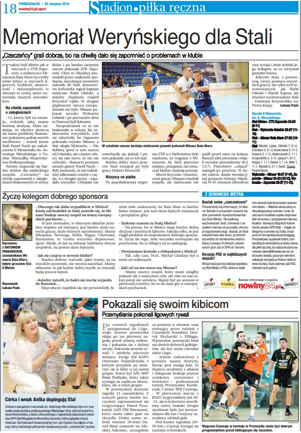 📖 Przenosimy się do 25 sierpnia 2014 roku gdzie na łamach „Stadionu” (dodatku sportowego Gazety Codziennej Nowiny) króluje piłka ręczna z Memoriałem Antoniego Weryńskiego w Mielcu oraz przygotowaniem do sezonu Czuwaju Przemyśl ⤵️